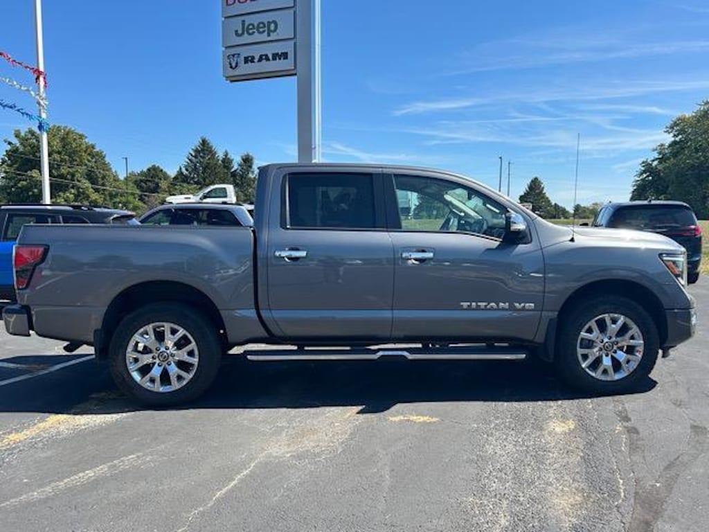 12 Speakers, 3.692 Axle Ratio, 4-Wheel Disc Brakes, ABS brakes, Air Conditioning, Alloy wheels, AM/FM radio: SiriusXM, Auto High-beam Headlights, Auto tilt-away steering wheel, Auto-dimming door mirrors, Auto-dimming Rear-View mirror, Automatic temperature control, Blind Spot Warning, Brake assist, Bumpers: chrome, Carpet Floor Mats (L95), Chrome wheels, Compass, Delay-off headlights, Driver door bin, Driver vanity mirror, Dual front impact airbags, Dual front side impact airbags, Electronic Stability Control, Emergency communication system: NissanConnect Services, Front anti-roll bar, Front Bucket Seats, Front Center Armrest, Front dual zone A/C, Front fog lights, Front reading lights, Front wheel independent suspension, Fully automatic headlights, Garage door transmitter: HomeLink, Heated door mirrors, Heated Front Captain's Seats, Heated front seats, Heated steering wheel, Illuminated entry, Knee airbag, Leather steering wheel, Leather-Appointed Seat Trim, Low tire pressure warning, Memory seat, Navigation system: NissanConnect Navigation, NissanConnect featuring Apple CarPlay and Android Auto, NissanConnect Services Powered By SiriusXM, Occupant sensing airbag, Outside temperature display, Overhead airbag, Overhead console, Panic alarm, Passenger door bin, Passenger vanity mirror, Power door mirrors, Power driver seat, Power passenger seat, Power steering, Power windows, Protection Package 1, Radio data system, Radio: NissanConnect w/Navigation, Rain sensing wipers, Rear anti-roll bar, Rear seat center armrest, Rear Seat Entertainment (H93), Rear step bumper, Rear Under Seat Storage, Rear window defroster, Remote keyless entry, Running Boards w/Chrome Accents, Security system, Speed control, Speed-sensing steering, Speed-Sensitive Wipers, Splash Guards, Split folding rear seat, Steering wheel memory, Steering wheel mounted audio controls, Tachometer, Telescoping steering wheel, Tilt steering wheel, Titan Box 5.5ft, Traction control, Trip computer, Turn signal indicator mirrors, Variably intermittent wipers, Voltmeter, Wheels: 20" x 8" Chrome.